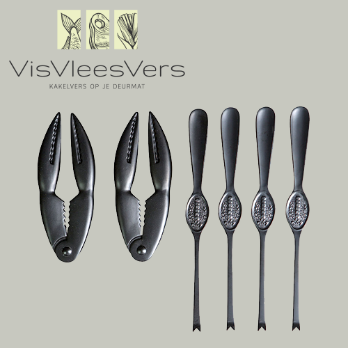 Stijlvolle zeevruchtenset met vier maal bestek en twee roestvrijstalen zwarte krakers. Wordt geleverd in een decoratieve geschenkverpakking. Handwas wordt aanbevolen.